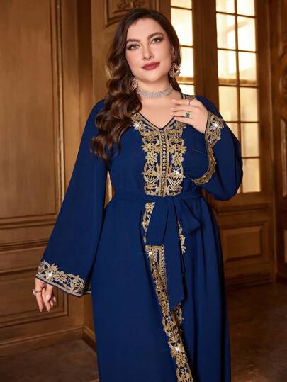 Layrah Plus Size Women's Gold Embroidered Modest Elegant Luxury Long Sleeve Arabian Dress With Front Closure, Kaftan - Navy Blue - View 1
