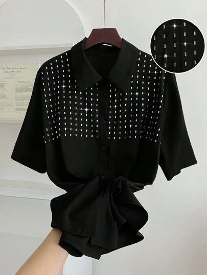 SHEIN LUNE Plus Size Women's Black Rhinestone Embellished Short Sleeve Blouse - Black - View 1