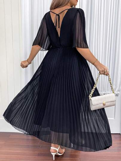 Celure Plus Size Women's Elegant Deep V-Neck Ruffle Short Sleeve Long Pleated Dress With Flowy Hem, Summer - Black - View 2