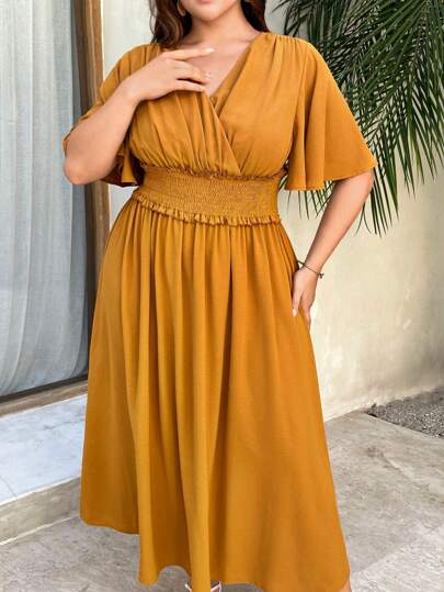 Mulvari Plus Size Women's Plain Short Sleeve Daily Wear Dress - Yellow - View 1