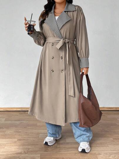 Flirla Plus Size Women's Solid & Plaid Patchwork Long Sleeve Trench Coat - Khaki - View 1