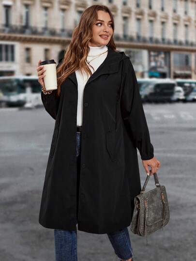 SHEIN Clasi Plus Size Women's Solid Color Simple Daily Hooded Long Sleeve Trench Coat - Black - View 1