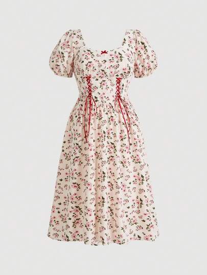 SHEIN MOD Plus Size Women's Summer Vacation Style Printed Dress With Color Contrast Ribbon Belt - Multicolor - View 1