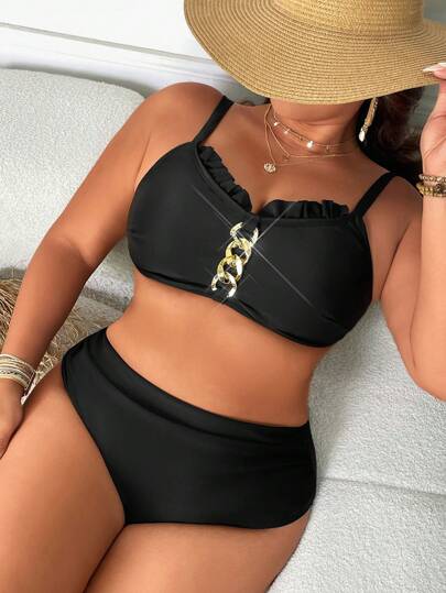 SHEIN Swim Curve Plus Size Women Black Ruffle Trim 2pcs Bikini Set, For Summer Beach Vacation - Black - View 1