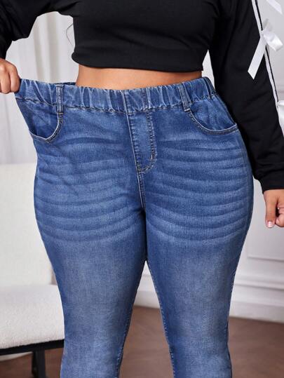 SHEIN CURVE+ Plus Size Women Plus Size Basic Blue Denim Stretch Pants - Medium Wash - View 8