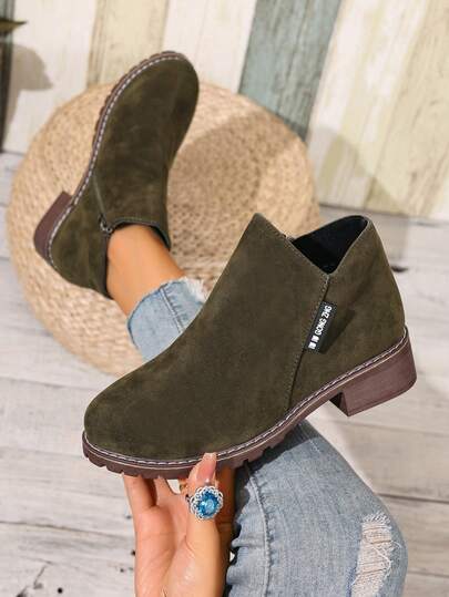 Plus Size Women's Side Zipper Ankle Boots, Fashionable Multi-Function Suede Booties, American Style Short Boots, Autumn/Winter New Arrival - Army Green - View 1