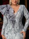 Aureia Plus Size Elegant Luxury Deep V Smoky Blue Sheer Long Sleeves Waist Ruffle Luxury Sequins Stitching Wedding Dress Satin Large A-Line Hem Suitable For Wedding, Party, Celebration, Formal Dinner Gown (Heavy Design)