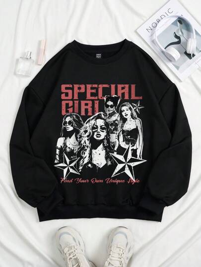 SHEIN EZwear Plus Slogan & Figure Graphic Drop Shoulder Sweatshirt - Black - View 1