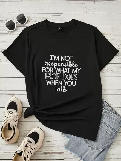 SHEIN Unity Plus Slogan Graphic Tee, I'M NOT Responsible FOR WHAT MY FACE DOES WHEN YOU Talk, Summer - Black - View 1