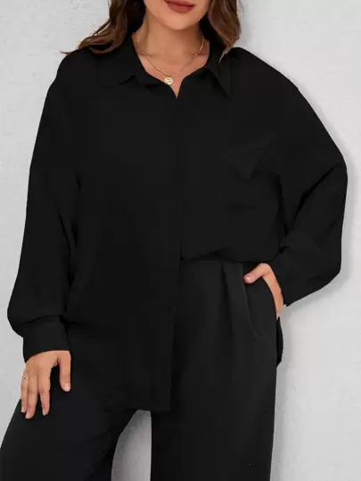 SHEIN LUNE Plus Solid Drop Shoulder Shirt - Black - View 1