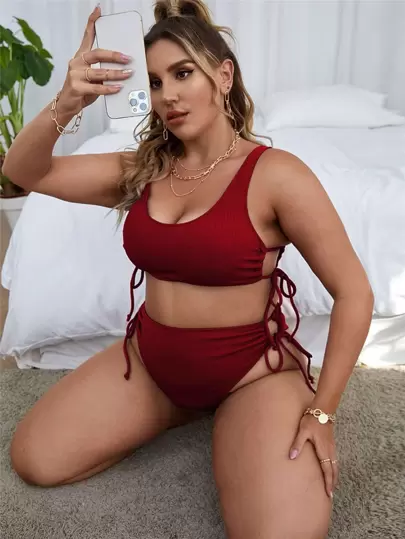 Plus Size Solid Tie Side High Waisted Bikini Set Summer Beach - Burgundy - View 1
