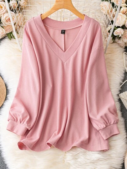 SHEIN LUNE Plus Solid V Neck Bishop Sleeve Tee - Pink - View 1