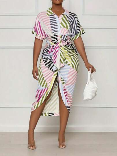 SHEIN LUNE Plus Striped Print Batwing Sleeve Belted Shirt Dress For Summer - Multicolor - View 1