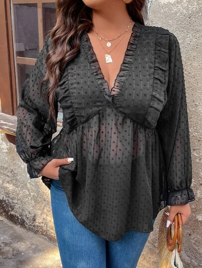 SHEIN LUNE Plus Swiss Dot Frill Trim Flounce Sleeve Blouse - Black - View 1