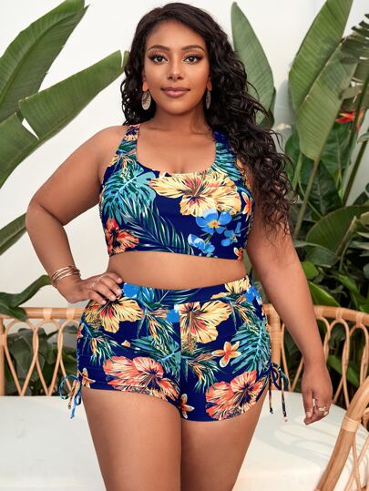 Plus Size Tropical Print Backless Shorts Bikini Set Summer Beach - Multicolor - View 1