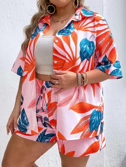 SHEIN Holidaya Plus Tropical Print Blouse & Shorts - Multicolor - View 1