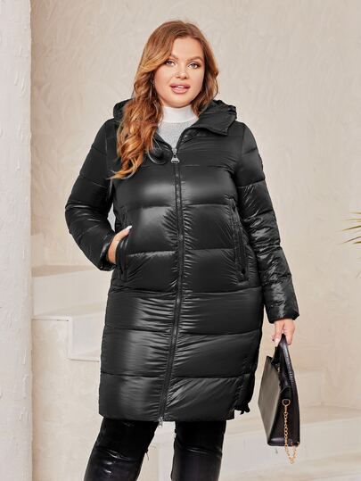Plus Size Zip Up Tape Hooded Puff Padded Coat - Black - View 1