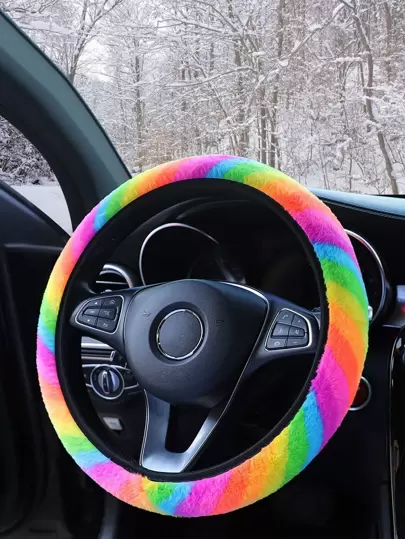 Plush Rainbow Striped Car Steering Wheel Cover - Multicolor - View 1