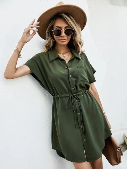 Pocket Front Drawstring Waist Shirt Dress - Army Green - View 1