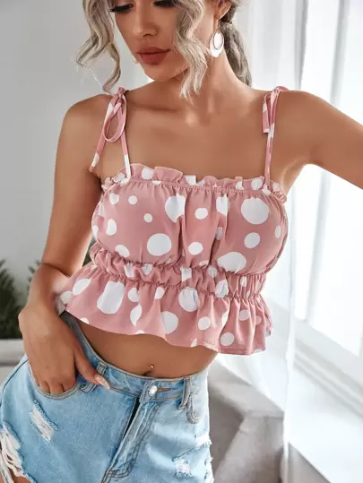 Polka Dot Knot Shoulder Ruffle Hem Cami Top - Dusty Pink - View 1