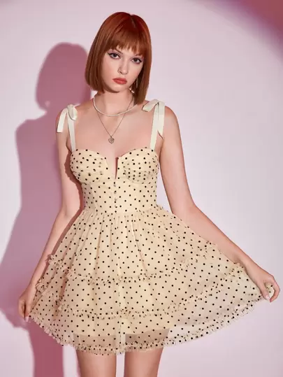 SHEIN Polka Dot Print Layered Hem Dress - Apricot - View 1