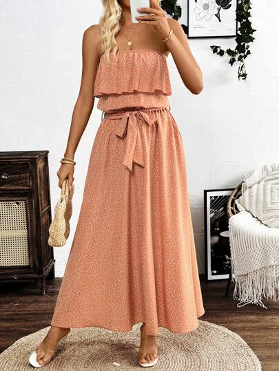 Breezaya Polka Dot Strapless Two-Layered Belted Dress, Summer - Orange - View 1