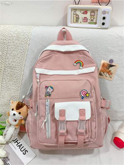 Waterproof Preppy Classic Backpack Pink Rainbow & Lollipop Decor For School - Baby Pink - View 1