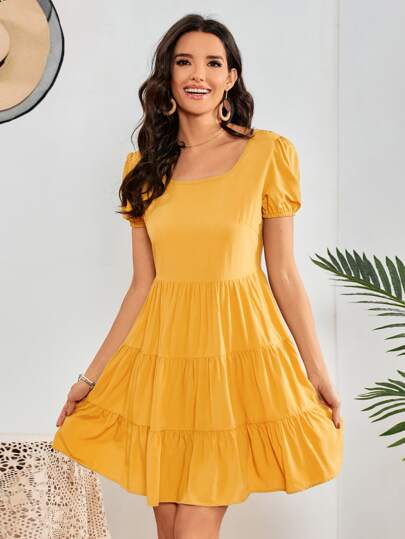 Puff Sleeve Flounce Hem Dress - Yellow - View 1