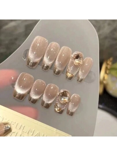Pure Handmade Nail Nail Nail Fake Nail Patch Nude Cat Eye Magic Mirror French Nail Wear - Apricot - View 1