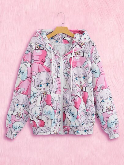 ROMWE Anime Cartoon Figure Print Zip Up Pocket Hoodie - Pink - View 1