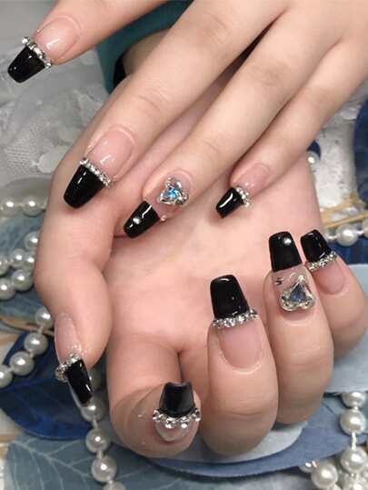 ROMWE Goth 24pcs Long Coffin Rhinestone Decor Fake Nail - Multicolor - View 1
