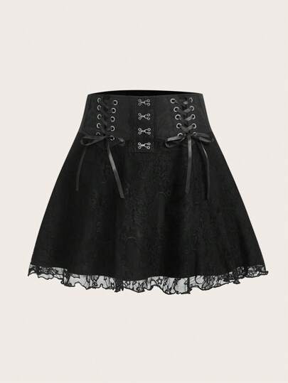 ROMWE Goth Lace Up Contrast Lace Skirt - Black - View 1