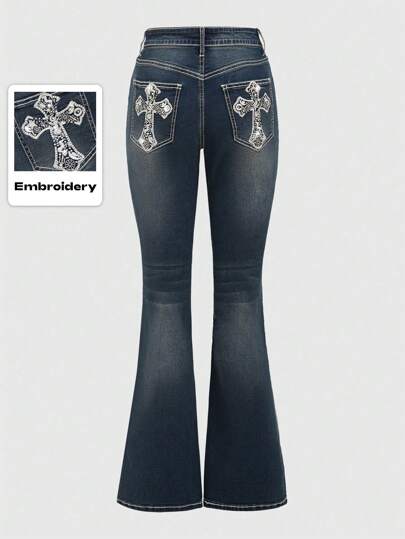 ROMWE Grunge Punk Y2k Retro Millennium Pocket Stars Moon Cross Embroidery Rhinestone Decor Skinny Flare Jeans, School - Navy Blue - View 1