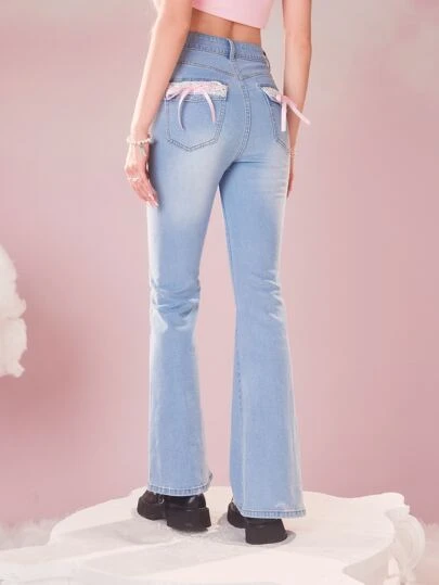 ROMWE Kawaii Bow Detail Flare Leg Jeans, School - Light Wash - View 1