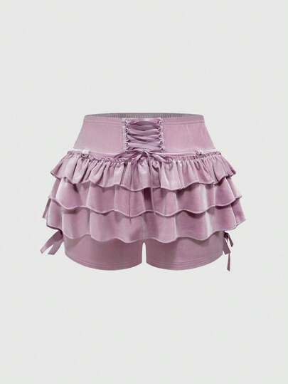ROMWE Kawaii Plus Size Women Dark Velvet Ruffle Hem Front Tie Bow Shorts With Anti-Exposure Design - Purple - View 1