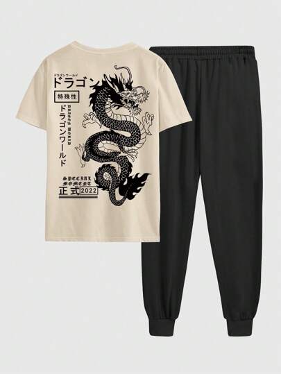 ROMWE MEN Anime Men Dragon Graphic Tee & Sweatpants - Multicolor - View 1