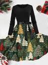 Christmas Vintage Christmas Tree & Reindeer Print High Waist Patchwork Long Sleeve Flare Dress With Ribbon
