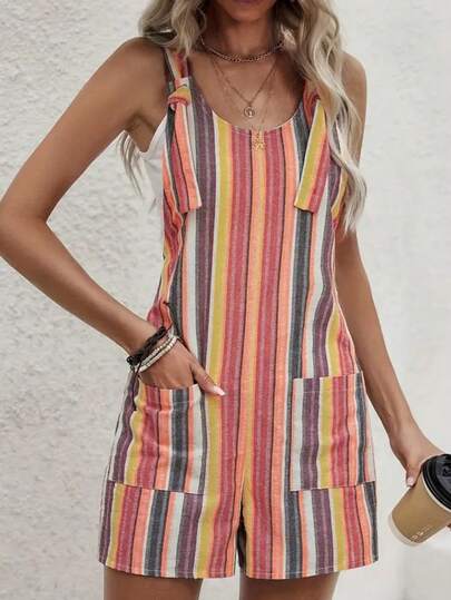 Rainbow Striped Pocket Button Twist Front Romper - Multicolor - View 1