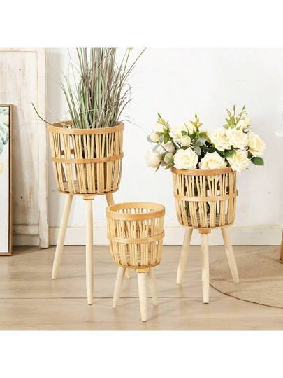 Rattan Plant Stand Woven Plant Stand Wooden Wicker Planter With Rattan Plant Display Rack For Living Room Balcony Planter Home Office Decoration - Khaki - View 1