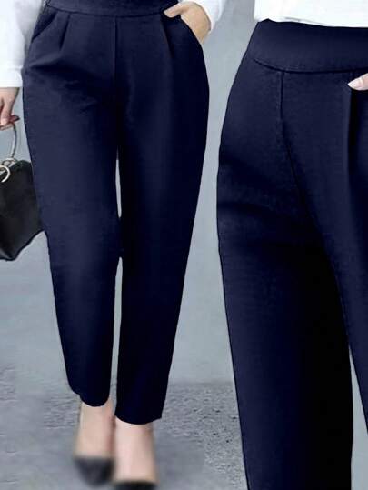 Regular Plus Size Women Plain Pocket Elegant Slim Fit Pants - Navy Blue - View 1