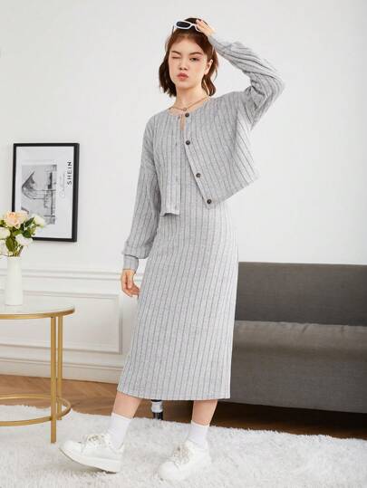 Ribbed Knit Cardigan and Cami Dress Set - Grey - View 1