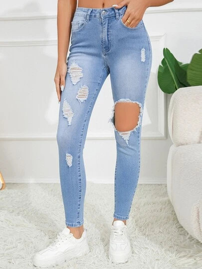 Ripped Cut Out Skinny Jeans - Light Wash - View 5