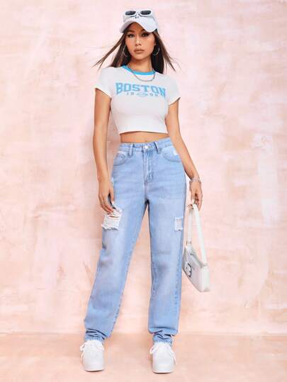 SHEIN EZwear Ripped Straight Leg Jeans - Light Wash - View 6