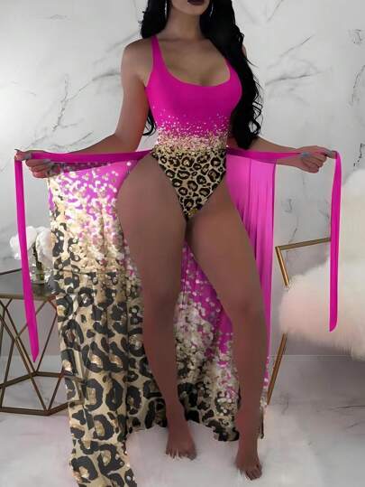 Rose Red One-Piece Swimsuit With Chiffon Beach Skirt Summer - Hot Pink - View 1