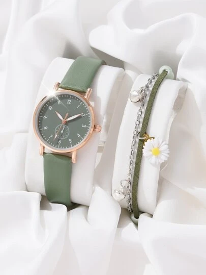 1pc Women Watch Round Pointer Quartz Watch And 1pc Daisy Decorative Bracelet Holiday Watch Set - Green - View 1