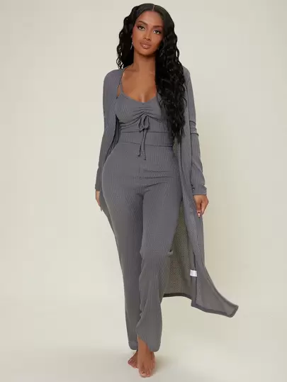 Ruched Bust Solid Lounge Set Cozy Outfit, Fall Winter Clothes - Dark Grey - View 1