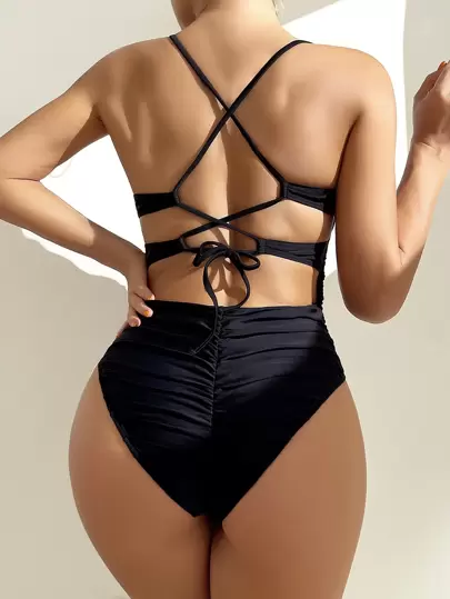 Swim Vcay Summer Beach Ruched Lace Up One Piece Swimsuit - Black - View 1