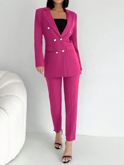 SHEIN Cottnline Double Breasted Blazer & Pants - Pink - View 1
