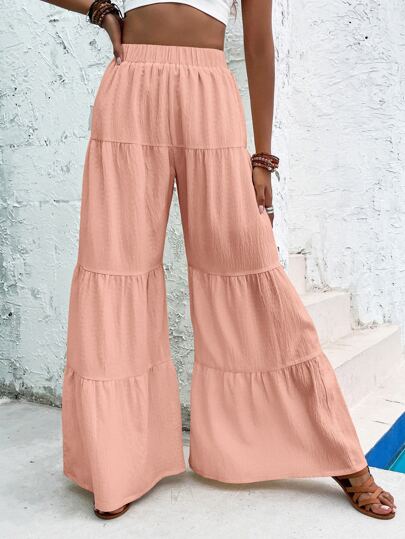 Ruffle Hem Wide Leg Trousers - Coral Pink - View 1