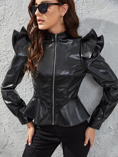 SHEIN Ruffle Trim Zipper PU Leather Jacket - Black - View 1
